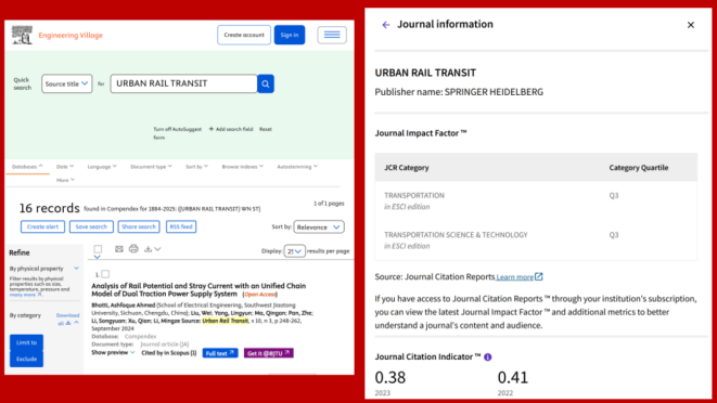URBAN RAIL TRANSIT《都市快轨交通(英文版)》创办于2015年,是城市轨道交通领域第一本英文国际学术期刊,每年出版4期。期刊由都市快轨交通杂志社负责编辑出版,联合Springer出版发行,中国城市轨道交通协会指导。目前,期刊已被ESCI、SCOPUS、DOAJ等30余个知名数据库收录,2022年进入中科院期刊分区表4区,2023年影响因子1.7,位居JCR的Q3。期刊已发表多篇高引用论文,年下载量近30万次。